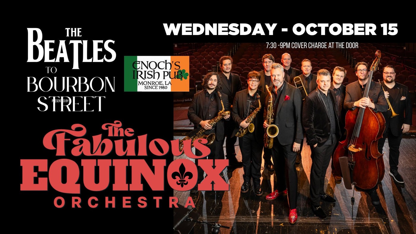 Jeremy and Clay are coming home for one unforgettable night — live at ENOCH’S IRISH PUB, their all-time favorite music venue in America! On Wednesday, October 15th, The Fabulous Equinox Orchestra brings their brand-new production, Beatles to Bourbon Street, to Monroe for the first and only time. This high-energy show reimagines Beatles classics with a bold New Orleans, spicy big band twist! The only way to make the Beatles’ music more fun... is to take them to Mardi Gras! With dazzling horn sections, rich storytelling and Southern charm, Jeremy Davis, Clay Johnson, and their world-class orchestra promise a night packed with music, memories, and pure joy. Cover TBD at the door!